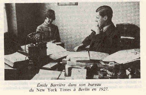 Né à Richelieu, le 5 octobre 1894, il fait ses études d'abord au Collège de Chambly puis à l'école des Hautes Études Commerciales de Montréal, nouvellement fondée. Il est de la deuxième promotion, celle de 1914. Dès son bas âge, il s'intéresse à la photographie. L'acquisition de connaissances en la matière pousse désormais ses aptitudes jusqu'au seuil d'une carrière qui débutera en 1916. Après un court stage en comptabilité à sa sortie des H.E.C., il s'enrôle volontairement dans l'armée canadienne, le 1er août 1914, mais ses parents s'y opposent et réussissent à le faire démobiliser. S'intéressant toujours à la photographie, il se rend à Valcartier où se trouve le camp d'entraînement militaire dans le but d'y faire de la photo et d'y réaliser des bénéfices. Il apprend que deux de ses camarades H.E.C. partent pour l'Europe sur l'invitation du directeur de l'école A.J. de Bray. Au bonheur d'Émile, l'un se désiste. Il pose alors sa candidature et part pour l'Europe. Le bateau est poursuivi par un sous-marin allemand, mais il arrive sain et sauf, raconte-t-il. On est en novembre 1915. Émile est à Paris où il est placé chez un fabricant -négociant de draps, Prudhomme et Frères, square Louvois. Il y travaille huit mois. Il revient en Amérique, à New-York, comme représentant d'une agence de presse française dans le but d'y diffuser des photographies de guerre aux journaux américains. Émile reste à New- York jusqu'au printemps 1917. Les États-Unis viennent de déclarer la guerre à l'Allemagne. Émile juge que la presse américaine sera davantage intéressée à montrer à ses lecteurs des photos de ses troupes en action sur le front français, et part de nouveau pour la France fin juin 1917 et arrive à St-Nazaire avant le premier contingent de 40,000 soldats américains. C'est à ce moment qu'il réussit son premier exploit. Grâce à son génie, sa perspicacité, ses photos du débarquement parviennent aux États-Unis une bonne semaine avant celles des autres, même des spécialistes. Elles font sensation! C'est un événement d'un intérêt exceptionnel. C'est la première fois dans l'histoire qu'une armée américaine traverse l'océan pour aller combattre à l'étranger. Émile reçoit sa récompense. William Randolph Hearst magnat de la presse américaine lui offre une situation magnifique qu'Émile accepte. Hearst obtient de Washington de le faire accréditer correspondant de guerre « photo-journaliste». Il porte l'uni- forme, ce qui facilite son travail et lui permet des voyages, visites aux troupes, sauf-conduits, autorisations rapides, etc. Après l'armistice, il accompagne l'armée d'occupation de la zone américaine à Coblentz. Il suit les personnalités politiques à la conférence de la Paix au quai d'Orsay, Wilson, Clémenceau, Lloyd Georges et finalement à l'été 1919, il photographie la cérémonie de la signature du traité de paix dans la galerie des glaces à Versailles, spectacle qui l'impressionne. Émile fait partie du groupe de journalistes qui accompagnent le président Wilson dans ses visites en Angleterre, puis aux régions dévastées de Belgique et de France. Une fois Wilson de retour aux États-Unis, on lui offre un tour d'Europe; c'est à l'époque une belle aventure. Il reste assez longtemps à Berlin pour voir l'existence du marché noir. Il perfectionne l'allemand qu'il a appris aux H.E.C., assiste à la conférence de Weimar, visite le port et la ville de Hambourg en pleine révolution spartakiste. Il visite Prague, Vienne, Budapest, Padoue, Turin, Milan. Il photographie les nouveaux chefs d'état et des scènes de la vie d'après guerre dans ces pays où la misère est grande. Lui-même, mal alimenté, revient malade à Paris. En novembre 1919, il donne sa démission; il veut revoir sa famille, se faire soigner, reprendre sa vie au Canada et s'embarque pour le pays. Il apporte avec lui un appareil français de « prise de vue» le plus perfectionné à l'époque, qui lui procure un emploi dès son arrivée dans la production de scènes d'actualité de la province de Québec. Au cours de 1922, il s'entend avec le service maritime du Canadien Pacifique afin de monter un laboratoire-photo industriel à bord de leur bateau croisière « l'Empress of Scotland » à l'occasion d'une croisière de deux mois en Méditerranée avec 1,200 passagers. U n tel laboratoire à grand débit, à bord d'un paquebot, c'est une innovation; service de 24 heures, cela ne s'est pas encore vu. A chaque escale, ce sont des prises de vue: Alger, le Caire, Athènes, Constantinople, Madère et Gibraltar, dont un reportage filmé complet sur Jérusalem. D'un caractère très sociable, Émile se fait de nombreux amis à bord, dont un couple d'Américains de Détroit avec qui il se lie d'amitié. Il se rend à Détroit et se trouve un emploi dans un studio. Au bout de six mois, il s'ennuie et regrette Paris et c'est alors qu'il accepte une offre du New-York Times qui retient ses services comme envoyé spécial « photo-territoire » qui comprend toute l'Europe et l'Afrique du Nord. C'est encore l'ère des voyages par train, il n'existe qu'un service aérien restreint et incertain Paris-Londres et naturellement pas de service transatlantique. Paris-Constantinople -4 jours et 4 nuits par train. Paris-Madrid, Paris-Rome -24 heures. Le Havre-New-York, cinq à six jours minimum sur quelques rares bateaux rapides. Émile visite les familles royales de l'époque, celle d' Angleterre, d'Espagne, de Roumanie, de Hollande, de Belgique, de Yougoslavie; il se rappelle quelques vols en zeppelin, en avions de guerre de type Caproni, Réguet Farman, avions fabriqués de toile de bambou et de cordes de piano, très légers et très fragiles, filant à une vitesse de 60 à 75 milles à l'heure. Émile Barrière fait l'ascension de l'Etna en Sicile à dos de mulet lors de l'éruption de 1923 jusqu'au cratère et sa rivière de feu. Il se rend à Madri